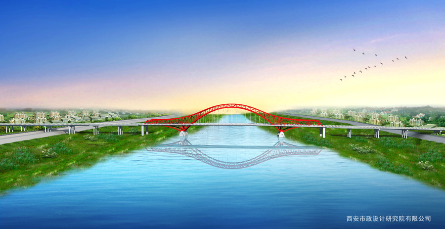 植物園渭河特大橋是寶雞市跨越渭河的一條重要通道,對于完善寶雞市路網(wǎng),增強(qiáng)寶雞市渭河南北的連通、加強(qiáng)各片區(qū)間的交通聯(lián)系、促進(jìn)城市經(jīng)濟(jì)的發(fā)展等具有重要意義。橋梁總長988.4m,橋梁寬度23-30m,主橋為65+158+65m三跨連續(xù)鋼桁拱橋。兩側(cè)邊跨為平弦桁梁,中跨為剛性拱柔性梁的鋼桁拱橋,橋梁跨徑布置合理,結(jié)構(gòu)比例協(xié)調(diào),與橋位處環(huán)境結(jié)合較好,似一輪剛剛升起的紅日,帶給大地勃勃生機(jī)。