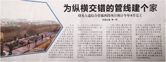 該項目于2018年12月開工建設(shè),目前已建設(shè)過半,計劃今年8月底竣工。三分院項目組成員在后續(xù)施工配合過程中,克服困難、主動服務(wù),為項目建設(shè)提供有力技術(shù)保障。建成后的曉光大道綜合管廊將與現(xiàn)狀的龍騰路、龍翔大道、西坪大道以及小韓村路等路段綜合管廊連通,形成蟠龍新區(qū)地下綜合管廊體系,使地下管線“血脈”互聯(lián)暢通。