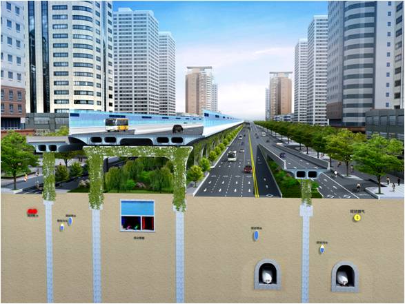 由于昆明路高架沿線地下管線極其復(fù)雜,同時又與地鐵、綜合管廊、地裂縫等交織,為保證工程的合理性,項(xiàng)目設(shè)計(jì)組多次實(shí)地踏勘、反復(fù)研究,采用了大跨度預(yù)應(yīng)力蓋梁、懸臂梁體系等工程方案對地下管線、構(gòu)筑物和地裂縫實(shí)現(xiàn)精準(zhǔn)避讓。同時,為減少行車噪音對橋梁兩側(cè)居民生活的干擾,在該項(xiàng)目中首次使用了高4.5m的聲屏障,并在聲屏障頂部設(shè)置LED光源,滿足照明與景觀要求。