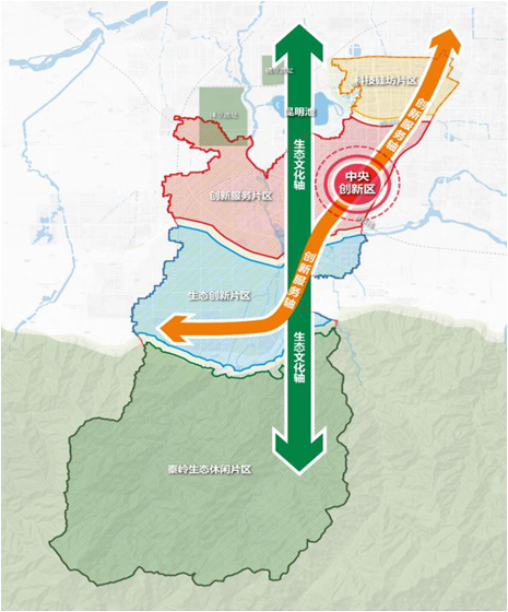四片:建立四個(gè)功能復(fù)合、特色鮮明的發(fā)展區(qū)。包括科技硅坊片區(qū)、創(chuàng)新服務(wù)片區(qū)、生態(tài)創(chuàng)新片區(qū)、秦嶺生態(tài)休閑片區(qū)。