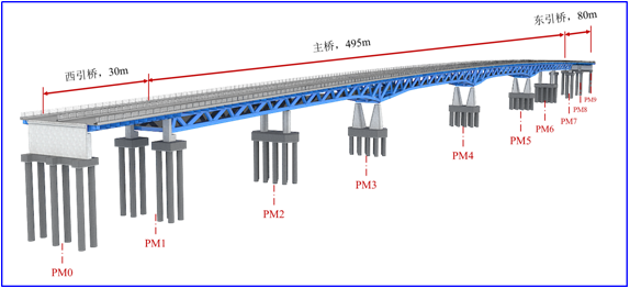 香槐六路跨灞河橋工程位于灞河隴海鐵路大橋下游至灞橋區(qū)、浐灞生態(tài)園區(qū)交界處,距北三環(huán)橋約700m,西起歐亞六路,東接香槐六路,全長732m,為特大型橋梁。其中主橋總長495m,采用六跨57.5+71+120+120+70+57.5m變高連續(xù)鋼桁梁結構,引橋及引道長237m。橋梁采用雙層橋面,上層橋面為機動車道,寬25m,下層橋面為人行通道,寬11m。其主跨120m跨度及充分利用鋼桁梁結構特點,采用了人、車分離式雙層橋面布局,均屬灞河上同類橋梁的首創(chuàng)。