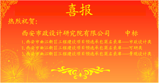 我公司成功入庫(kù)曲江新區(qū)“市政設(shè)計(jì)類”、“可研類”、“景觀設(shè)計(jì)類”工程建設(shè)項(xiàng)目預(yù)選承包商名錄 我公司交通分院與計(jì)劃經(jīng)營(yíng)部、景觀園林分院齊心協(xié)力、通力合作,在參與“西安市曲江新區(qū)工程建設(shè)項(xiàng)目預(yù)選承包商名錄庫(kù)”兩階段投標(biāo)的40多家競(jìng)爭(zhēng)企業(yè)中脫穎而出,成功入庫(kù)。
