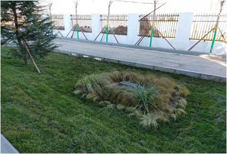 融入海綿城市設(shè)計理念,結(jié)合現(xiàn)場實(shí)際設(shè)置了植草溝、雨水花園、屋頂綠化等,充分“留住”雨水。