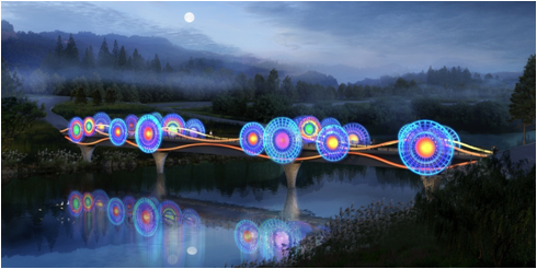 竹藝?yán)葮?/b>主體結(jié)構(gòu)為三跨連續(xù)鋼箱梁橋。本方案以廣西毛南族花竹帽為原型,利用圓形和發(fā)散形的骨架,建成或大或小的草帽狀構(gòu)筑物,點(diǎn)綴橋身,相映成趣。通過簡單優(yōu)美的線條表現(xiàn)山水倒影,意象深遠(yuǎn)。