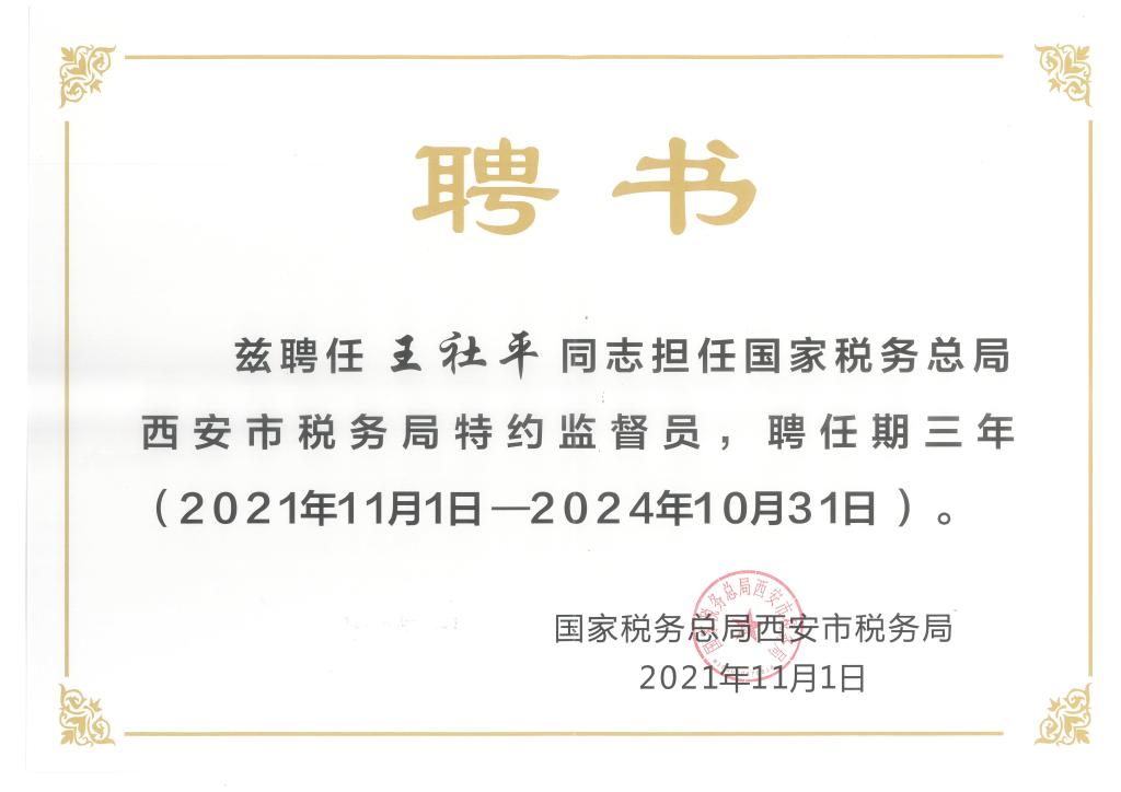 為進(jìn)一步深化作風(fēng)效能建設(shè)、提升管理服務(wù)水平、優(yōu)化稅收營(yíng)商環(huán)境,充分發(fā)揮社會(huì)監(jiān)督的積極作用,西安市稅務(wù)局面向社會(huì)聘請(qǐng)來自各行各業(yè)的特約監(jiān)督員。11月3日上午,西安市稅務(wù)局紀(jì)檢組主任高紅軍一行蒞臨我公司,特為我公司副總經(jīng)理、西安市政協(xié)委員王社平同志頒發(fā)國家稅務(wù)總局西安市稅務(wù)局特約監(jiān)督員聘書。