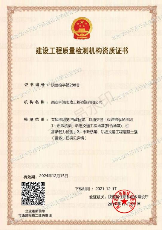 12月15日,科源公司市政橋梁、軌道交通工程結(jié)構(gòu)現(xiàn)場檢測資質(zhì)順利通過了陜西省住房和城鄉(xiāng)建設(shè)廳審批,成功獲得資質(zhì)延續(xù)。