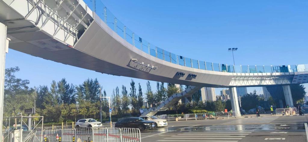 榆林高新區(qū)建業(yè)大道-長興路過街人行天橋(高新一中人行天橋)位于榆林市建業(yè)大道與長興路交叉口,主橋采用直徑83m的環(huán)形變截面鋼箱梁結(jié)構(gòu),主橋全長為245.05m,梁高1.2-1.8m,主橋?qū)?m,橋梁總面積2047㎡。天橋所有方向均采用一跨跨越現(xiàn)狀道路,主跨55.985m,在同類人行天橋中跨徑較大。通透的玻璃欄桿搭配曲線明快的主梁,猶如一條流動的綢帶,簡潔現(xiàn)代,婉約流暢。該天橋為榆林高新一中設置了專用梯道接入校內(nèi)方便師生使用,同時增加了電渦流調(diào)諧質(zhì)量阻尼器提升行人通行的舒適性。