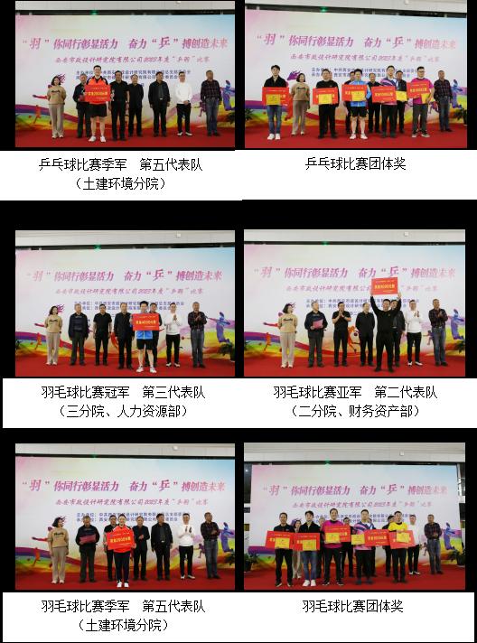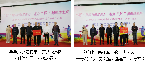 經(jīng)過一天時間的緊張角逐,乒乓球團(tuán)體賽和羽毛球團(tuán)體賽分別決出了前三名,第八代表隊榮獲乒乓球比賽冠軍、第一代表隊獲得亞軍、第五代表隊獲得季軍;第三代表隊榮獲羽毛球比賽冠軍、第二代表隊獲得亞軍、第五代表隊獲得季軍;比賽還設(shè)置了優(yōu)秀組織獎、道德風(fēng)尚獎、勇于拼搏獎、科學(xué)團(tuán)隊獎、最佳風(fēng)格獎,公司領(lǐng)導(dǎo)分別為各獲獎代表隊頒獎。