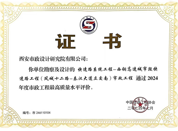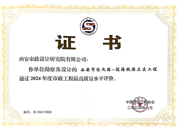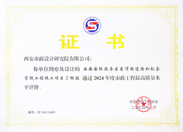 日前,根據(jù)中國市政工程協(xié)會發(fā)布的“2024年度通過市政工程最高質(zhì)量水平評價工程名單”,我公司承擔設計的“西安國際港務區(qū)杏渭路道路和配套管線工程施工項目2標段”、“快速路系統(tǒng)工程-西銅高速城市段快速路工程(鳳城十二路-秦漢大道立交南)市政工程”、“西安市經(jīng)九路-隴海鐵路立交工程”獲此殊榮。