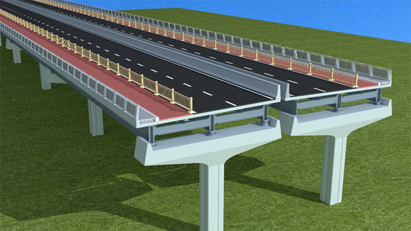 此標(biāo)準(zhǔn)圖集適用道路等級(jí)為城市主干路,荷載等級(jí)達(dá)城-A級(jí)、防撞護(hù)欄防撞等級(jí)SA級(jí)、設(shè)計(jì)安全等級(jí)一級(jí),橋梁外側(cè)統(tǒng)一設(shè)置預(yù)制裝配式人行道和非機(jī)動(dòng)車道。整體采用全預(yù)制方案,實(shí)現(xiàn)主體與附屬設(shè)施同步標(biāo)準(zhǔn)化設(shè)計(jì)。其中,鋼主梁體系創(chuàng)新采用“大縱梁+小縱梁”結(jié)構(gòu),大幅增強(qiáng)了結(jié)構(gòu)整體剛度與穩(wěn)定性,小縱梁的設(shè)置有效縮減混凝土橋面板跨徑,簡(jiǎn)化構(gòu)造;附屬結(jié)構(gòu)的整體預(yù)制提升了施工精細(xì)化程度,簡(jiǎn)化了現(xiàn)場(chǎng)安裝流程,真正踐行綠色低碳、經(jīng)濟(jì)節(jié)能理念,便于后期維護(hù)改造;同時(shí)通過增加整體式人行道板與防撞護(hù)欄共享橋面板錨固構(gòu)造,為遠(yuǎn)期交通發(fā)展預(yù)留了充足空間,未來可通過拆卸或重組附屬設(shè)施預(yù)制構(gòu)件靈活調(diào)整道路斷面形式,增強(qiáng)交通適應(yīng)性。